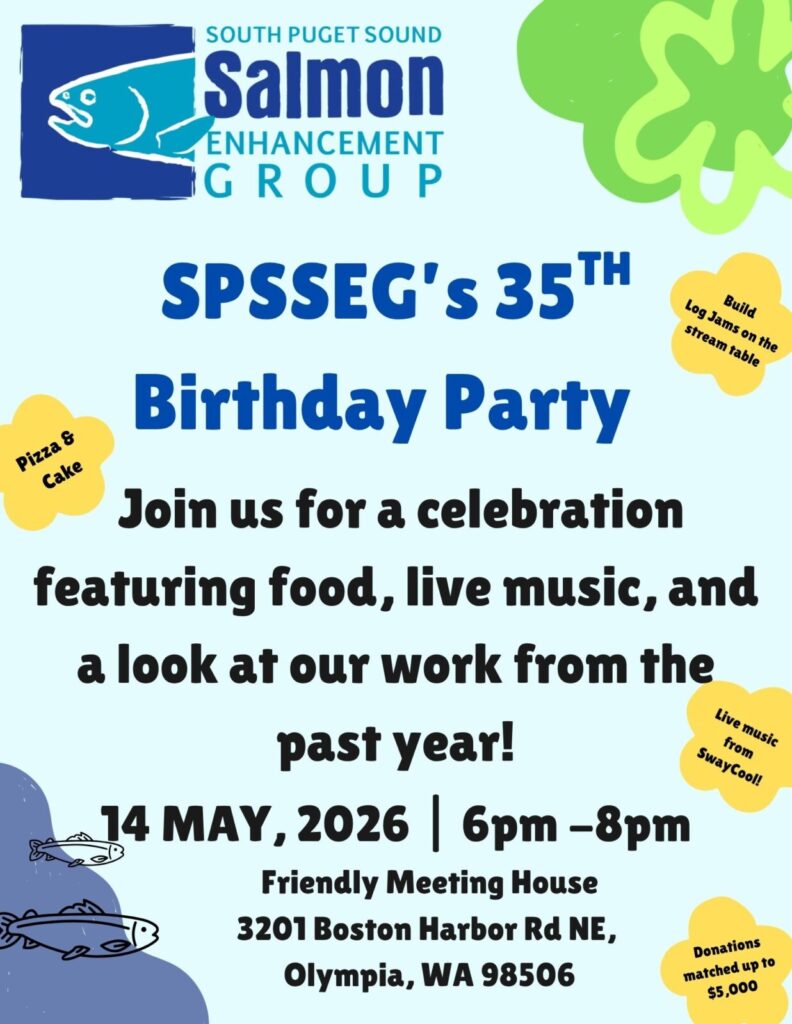 The South Puget Sound Salmon Enhancement Group (SPSSEG) is a local voice for regional salmon recovery. From the highest peak in the Cascades, to the fertile shorelines and estuaries of Puget Sound, we restore salmon habitat with willing landowners. We seek out and partner with other organizations to help plan, fund, carry out, and monitor fishery enhancement and habitat restoration projects. We believe that by collaborating with local communities, schools, and individuals in King, Pierce, Kitsap, Thurston and Mason Counties, we can increase salmon numbers in our rivers and streams. Our non-profit non-governmental status helps us to get real results.